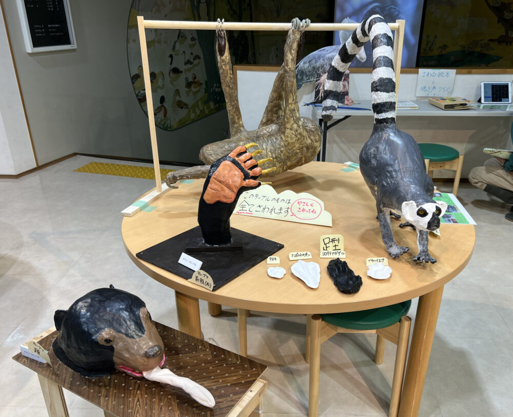 動物の骨格や羽、卵、実物大模型等の素材を自由にさわることができます。