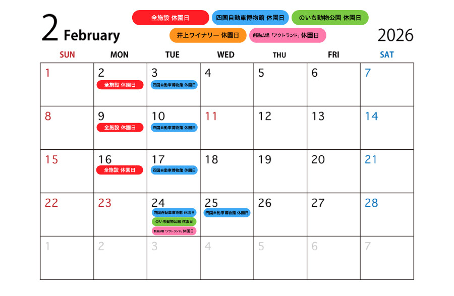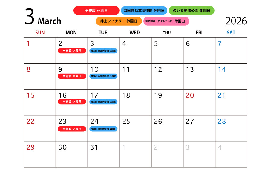 【休園日カレンダー】 ※休園日をご確認の上、ご来園・ご来店ください。