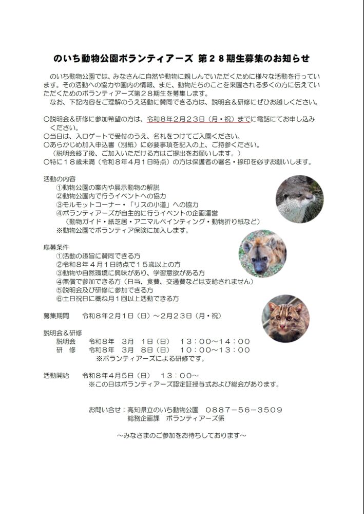のいち動物公園のイベントのお手伝いや動物のガイド、自主企画イベントなどで、来園者のみなさまと動物公園の架け橋となってくださる方を募集します!
