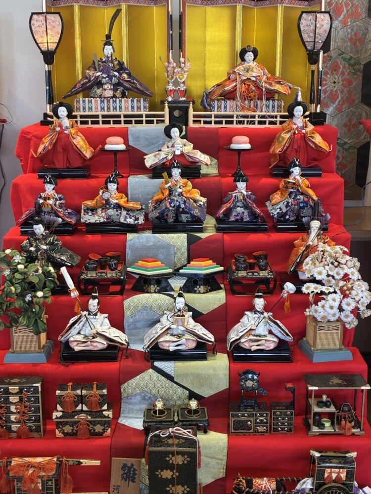 七段飾りのお雛様や、親王飾りのお雛様、ちいさなお雛様を華やかに飾っています。