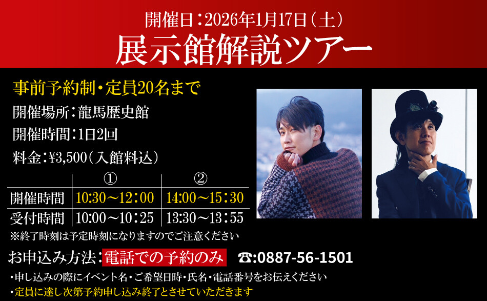 柴田恵介さん(元土佐おもてなし勤王党 岡田以蔵役)としんちゃん(元土佐おもてなし勤王党 中岡慎太郎役)による龍馬歴史館解説ツアーを開催します。解説のほか、写真撮影や館内クイズも予定しております。