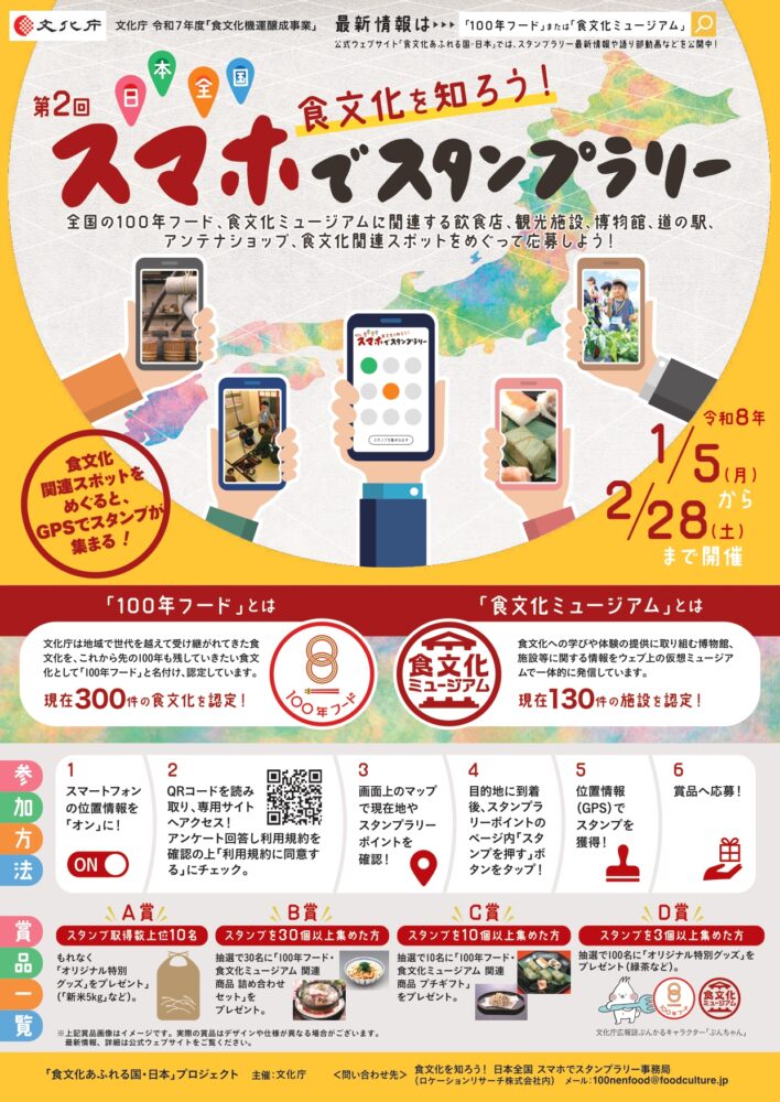 全国の100年フード、食文化ミュージアムに関連する飲食店、観光施設、博物館、道の駅、アンテナショップ、食文化関連スポットをめぐって応募しよう!
